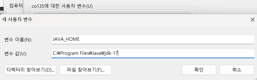 사용자 변수에서 새로만들기 : 이름은 JAVA_HOME으로 하고 변수 값에는 아까 설치했던 jdk-17 폴더 경로 넣기