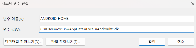 그리고 다시 아까 했던 환경 변수 들어가서 시스템 변수 ANDROID_HOME의 변수 값을 동일하게 설정하기