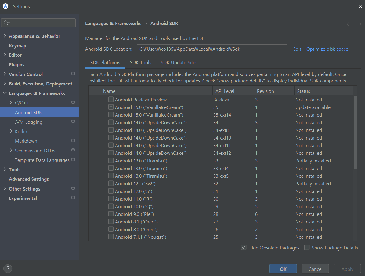 OR 메뉴에서 Tools - SDK Manager 들어가서 경로를 넣어도 된다.