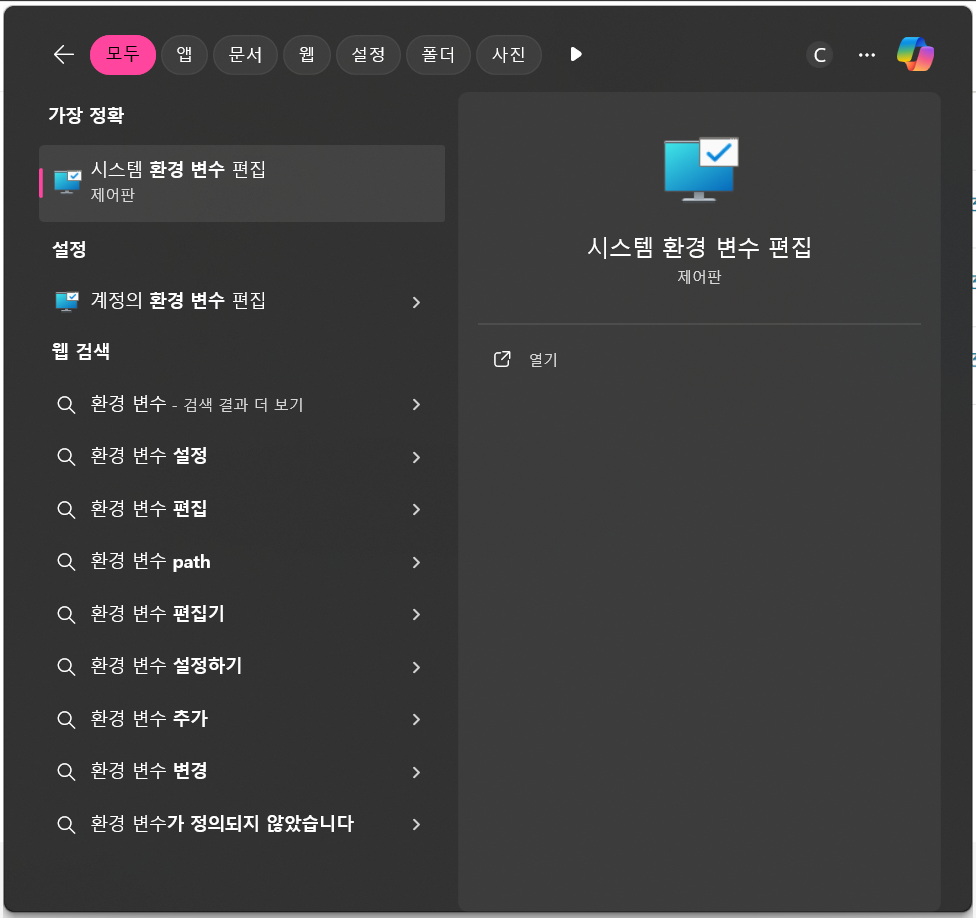 1. 윈도우 검색창에 '환경 변수' 입력해서 환경 변수 들어가기