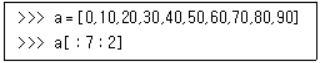 - a[시작점 : 끝점 : 넘어가는 수(증감값)] / a[0]~a[6] 까지의 값에서 2칸씩 증가이므로 0, 20, 40, 60